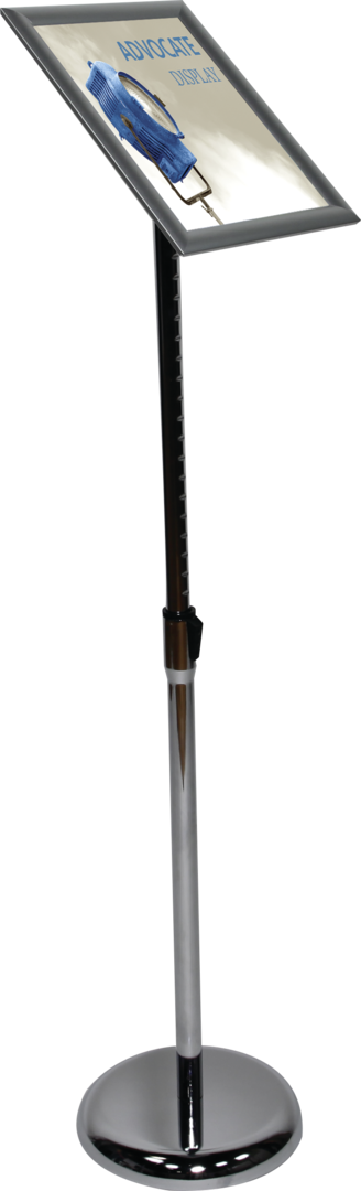 Easily display a graphic or message with the Advocate, a versatile and easy-to-assemble sign stand. The Advocate features a telescopic post with a chrome finish and circular base. The snap-edge frame can be rotated used in portrait or landscape configurations, rotated 360° or positioned at any desired angle.