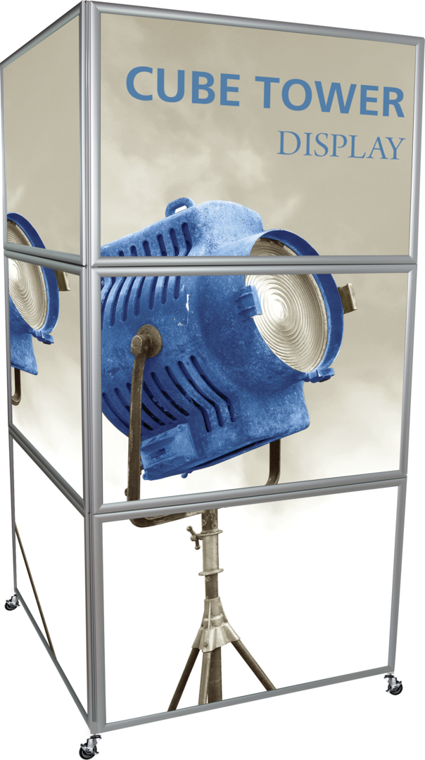 Maximize your messaging in any lobby, entryway, at any event or trade show with the versatile Cube Tower. Available in a variety of configurations and sizes, the Cube Tower is a cube-shaped tower that features easy-to-use snap frames on all four sides, and a toolless assembly. Choose from silver or black snap frame options, and optional wheels or feet for the display. Custom sizes also available.