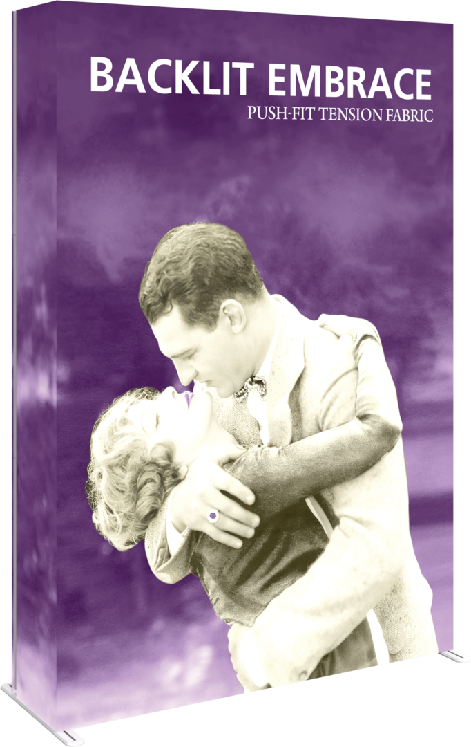The Embraceâ„¢ 5ft full height (2 Quad x 3 Quad) backlit push-fit fabric display is a sleek illuminated collapsible display. The Backlit Embrace makes it simple to make a big impact in minutes with easy-to-attach patent-pending LED lighting and a push-fit backlit graphic that attaches to channel bars around the perimeter of the frame. Simply attach lights to the collapsible frame and insert the graphic into the channel bars for an impactful illuminated display solution! Graphics available as single or double-sided with endcaps. No tools are required for assembly. A protective molded case for storage and transport are included. Option available to purchase frame, LED lights and case only.