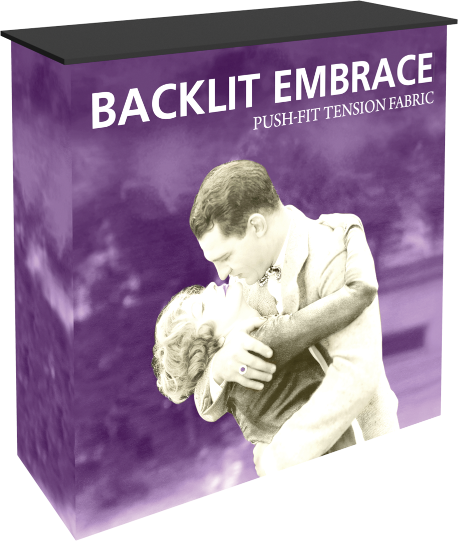 The Embrace⢠Backlit Counter is a sleek, collapsible push-fit tension fabric counter that delivers a vibrant pop to branding and messaging. The Embrace Backlit Counter pairs a collapsible, white frame and channel bars that hold push-fit SEG fabric graphics. Lights attach simply to the top and bottom cross bars. The counter comes with Intensity backlit fabric graphics on the front and a whte backer. The counter is finished with a laminated counter top for a sleek appearance. Embrace Counter requires no tools for assembly, is lightweight and highly portable. It packs away as easy as it sets up!