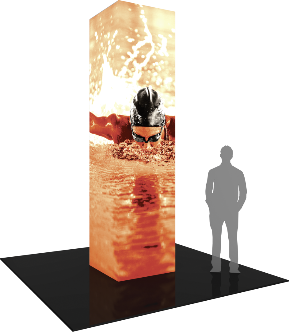 The Formulate® Backlit Tower 01 is an illuminated 12ft tall, 3ft square structure that will transform any environment through form, fabric and lighting. Perfect for inclusion in a tradeshow exhibit, to cover columns in an exhibit hall and for events and retail displays. The Formulate Backlit Tower 01 combines the latest developments in fabric printed technology with aluminum tube frames and interior LED lighting to add dimension, decor and sculpture. Mix and match with other Formulate architectural structures, backwalls, counters and kiosks to create your own display. Captivate your audience with an illuminated fabric tower!