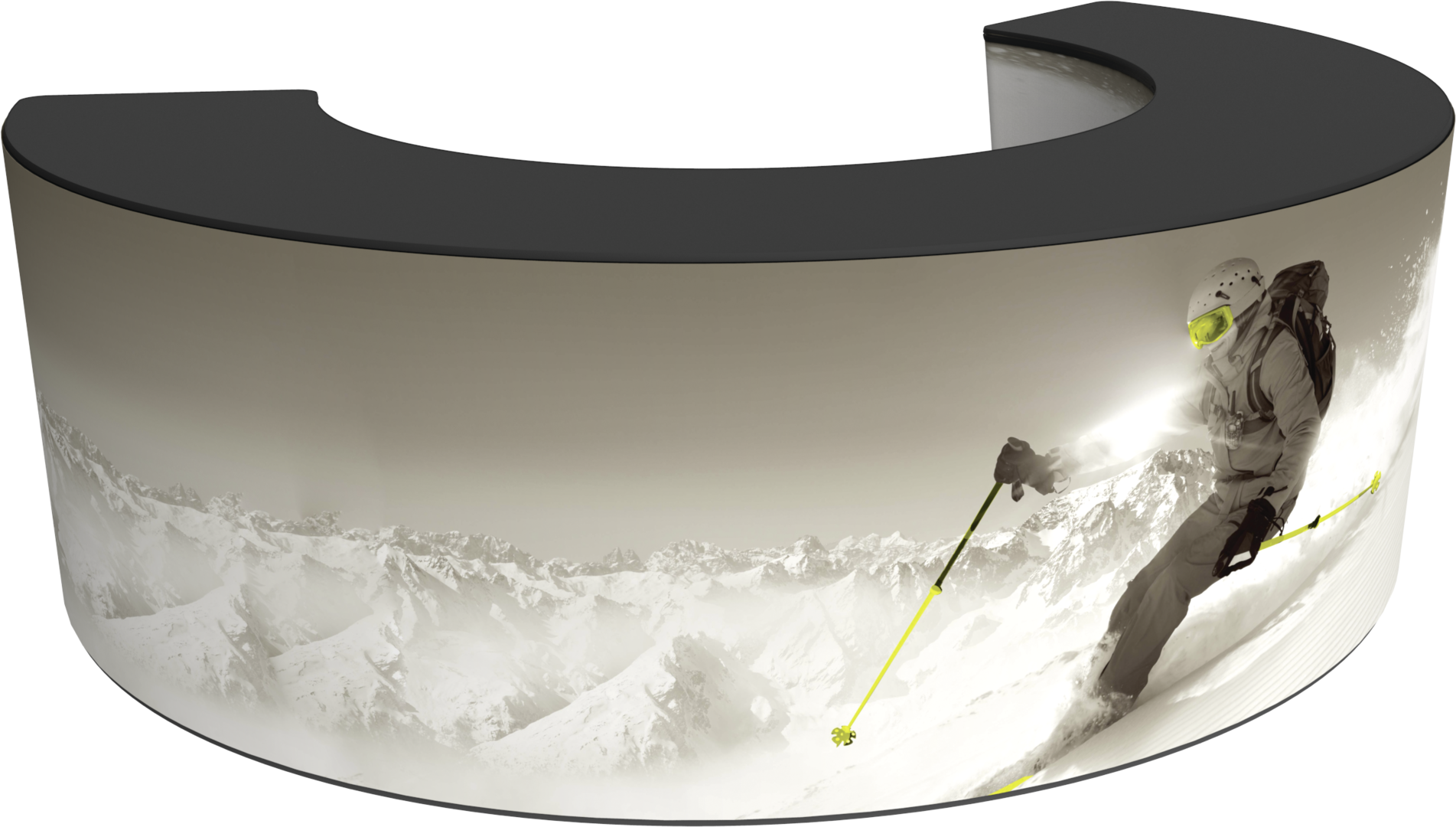 Formulate® Bar counter 05 adds modern flare to any trade show exhibit, event or POP display. The curved counter pairs push-fit fabric graphics with a durable countertop and base, and provides the ideal configuration to create a display or reception counter.