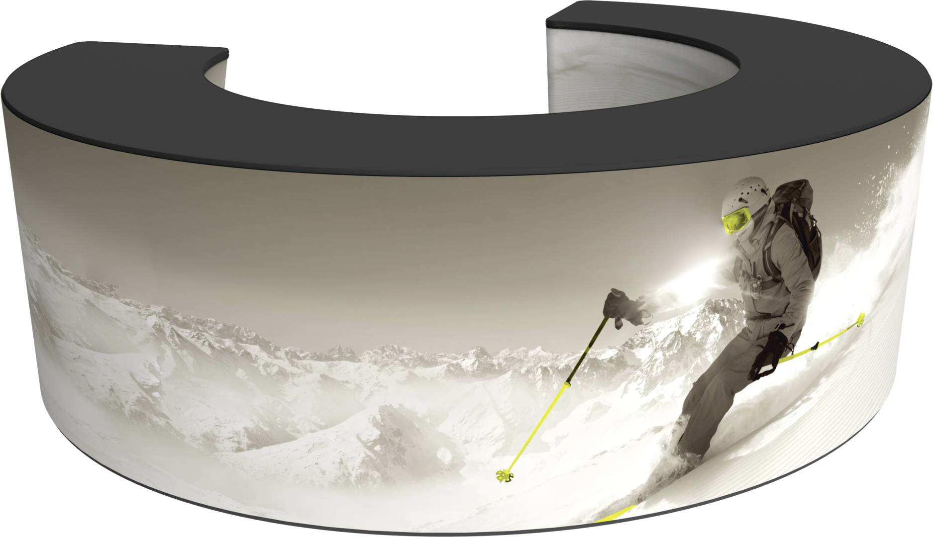 Formulate® Bar counter 06 adds modern flare to any trade show exhibit, event or POP display. The curved counter pairs push-fit fabric graphics with a durable countertop and base, and provides the ideal configuration to create a display or reception counter.
