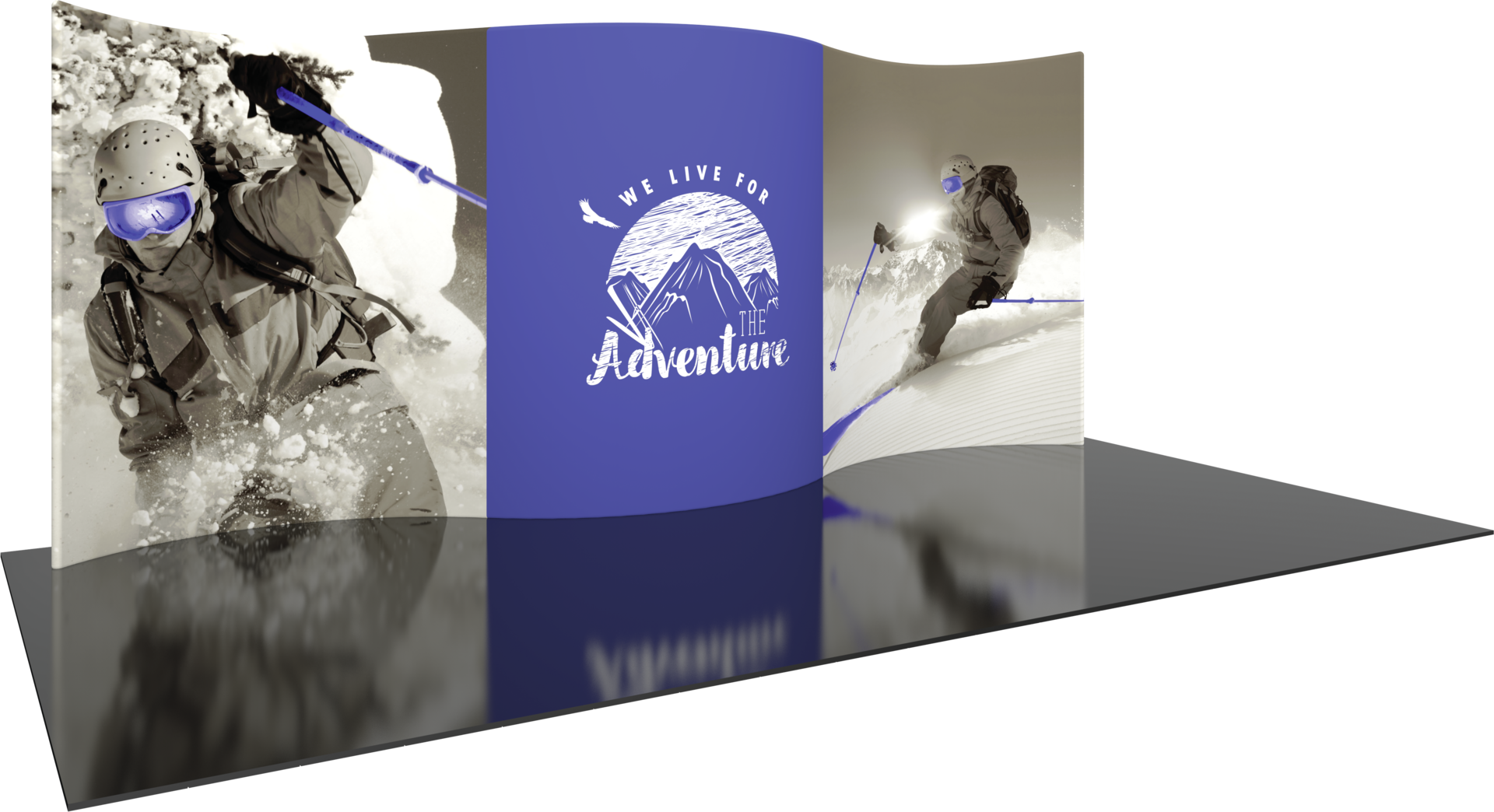 Formulate® Designer Series 20ft Backwall Kit 01 display has organic, flowing shapes and is portable and easy to assemble. The kit includes an aluminum tube frame with snap-buttons/spigot connectors and zipper pillowcase fabric graphics. Simply connect the tubes, pull the pillowcase fabric graphic over the frame and zip.