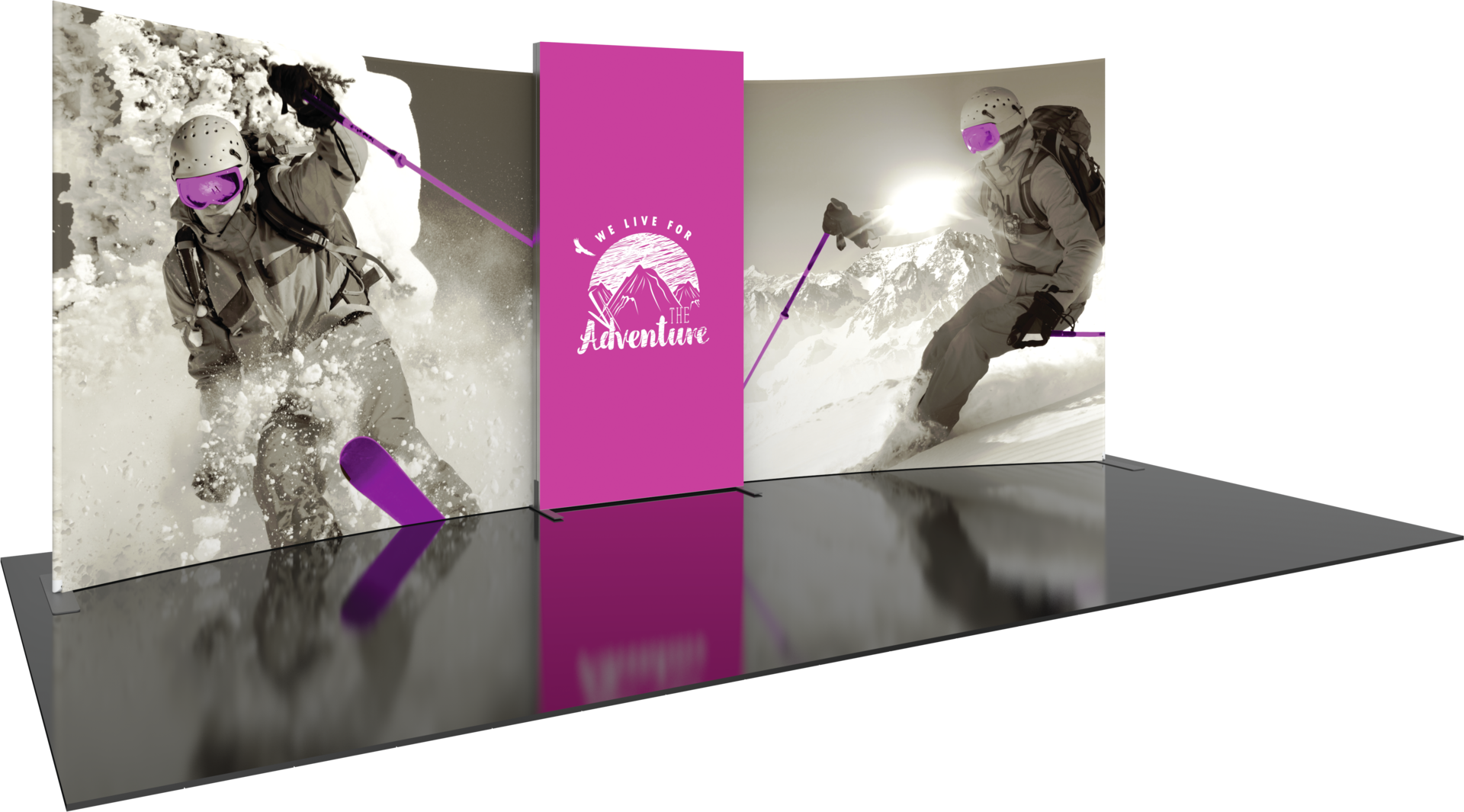 Formulate® Designer Series 20ft Backwall Kit 02 showcases a stylish, geometric shaped backwall and centered rectangular light box designed to draw attention! The kit features one aluminum tube frame with snap-buttons/spigot connectors and zipper pillowcase fabric graphic, as well as an extrusion based light box that features built-in LED lights and a push-fit SEG fabric graphic. A show stopper for certain!