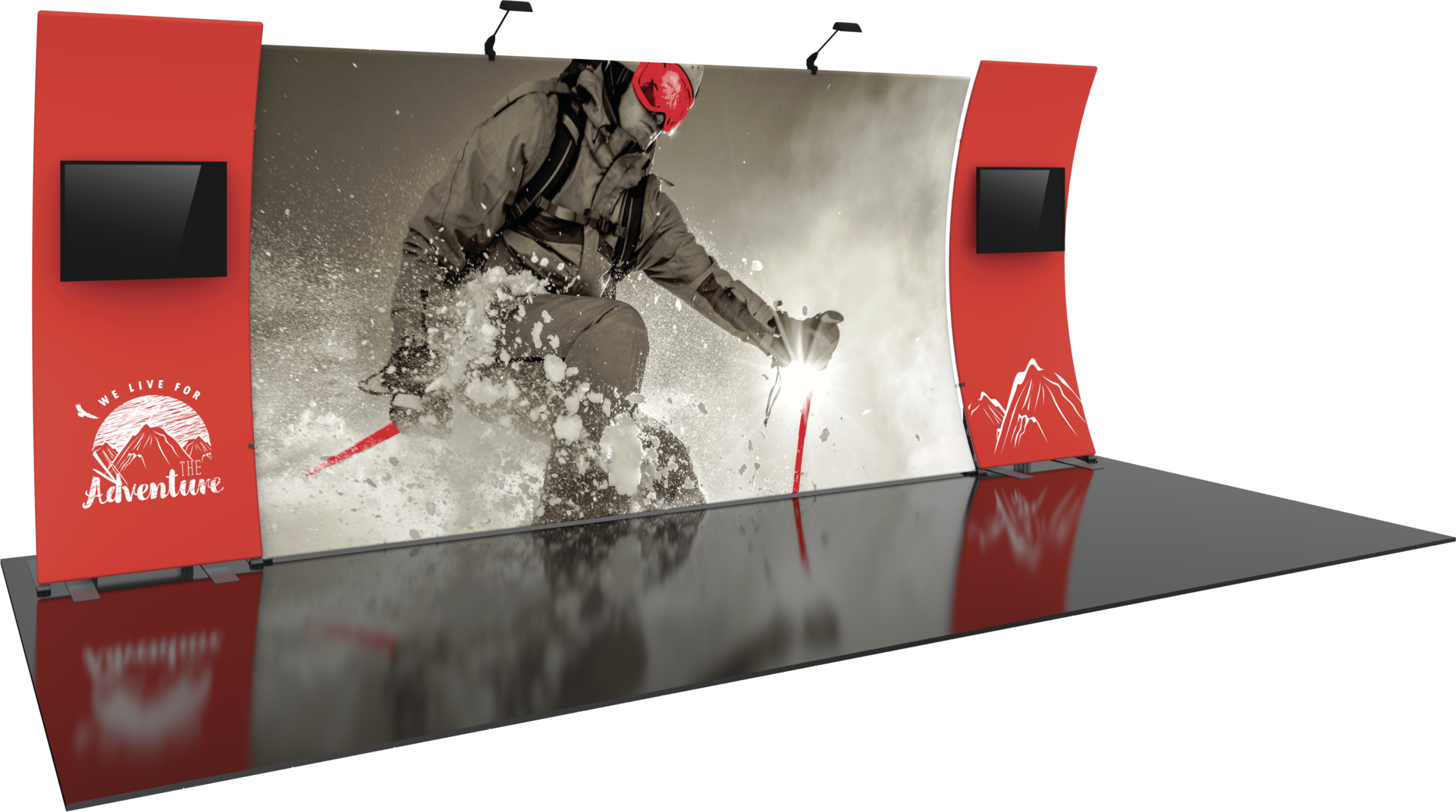 Formulate® Designer Series 20ft Backwall Kit 12 combines multimedia with ample real estate for a prominent message on the center wall. Kit 12 includes three aluminum tube frames with snap-buttons/spigot connectors, three zipper pillowcase fabric graphics and two monitor kiosks that support medium monitors for multimedia presentations. Assembly is simple - connect the tubes, place the monitor mount kiosks, pull the graphics over the frames and zip.