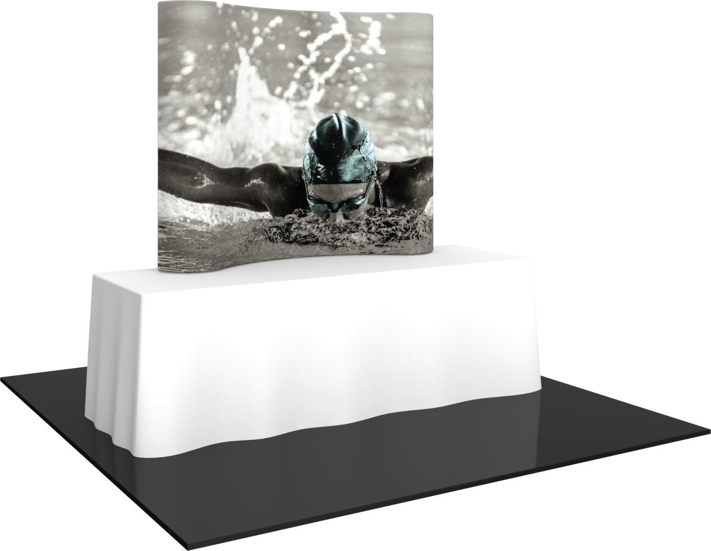 The Formulate® Essential Tabletop Horizontal Curve Display has a customary frame and is portable. The economy aluminum tube frame features bungee cords, rounded corners and comes with a one year limited warranty. Simply pull the pillowcase fabric graphic over the frame and zip. All displays have an overall height of 5ft and fit on a 8ft wide table and come with a canvas carry bag.