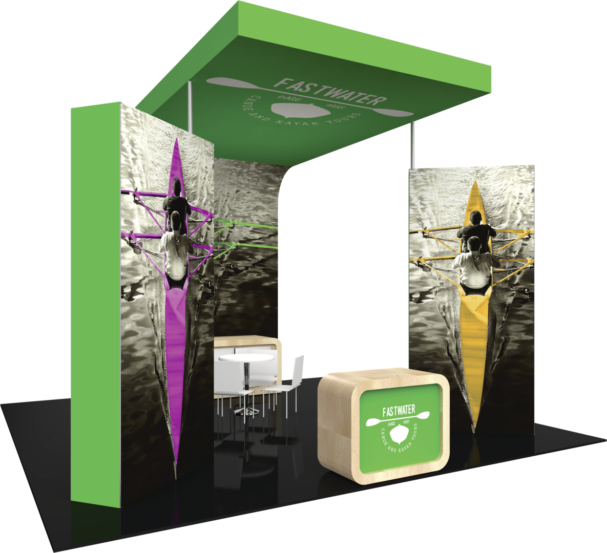 Monopolize the tradeshow floor with the bold, sophisticated presence of Formulate® Fusion Kit 09. Standing 14' tall and over 10' wide, the L-shaped exhibit structure features a rooftop that extends 18' into the exhibit space. This main structure is comprised of an aluminum tube frame, coupled with pillowcase fabric graphics. This main fabric structure is structurally supported by a freestanding laminated counter that is 7' 10.5" wide by 3' h by 2.5' deep, providing plentiful secure storage and countertop space. Two structural walls are positioned at 45 degree angles in the space and stand 11' tall by 5' wide, with a depth of 1.5'. The rectangular structures combine heavy duty aluminum extrusion frames with push-fit fabric graphics, which are designed for bold, vibrant graphics and messaging! A freestanding laminated reception counter establishes the area for exhibit staff to meet and greet guests.