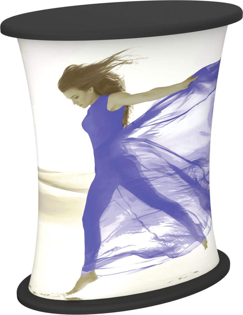 Formulate® Pillar counter couples lightweight hardware with a printed stretch silicone edge fabric graphic (SEG) to create a funky and functional reception stand with an oval tabletop. Easily add a reception space, extra display capability or storage to any trade show exhibit or event and retail environment. Tabletop and base are available in choice of four finishes.