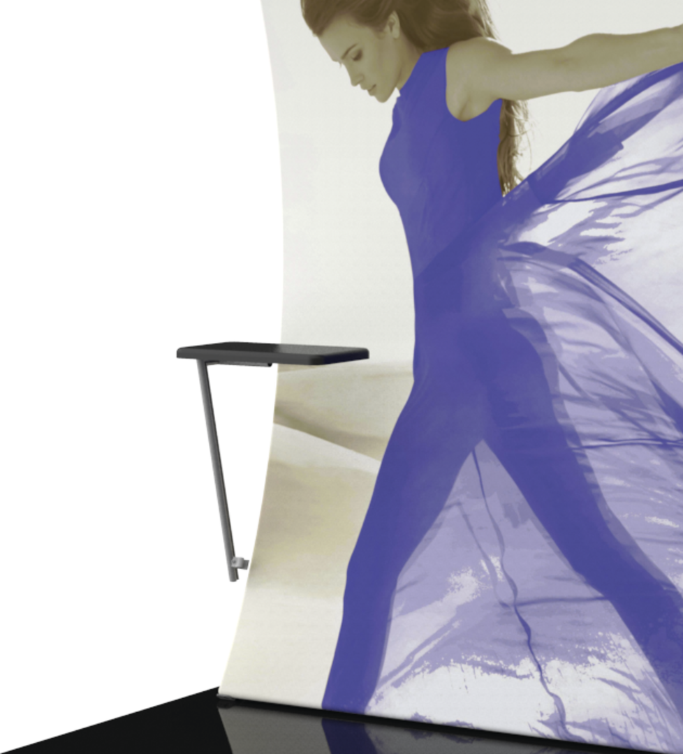 - Choose between left or right side mount- Can be easily added to any Formulate Master 8ft, 10ft or 20ft backwall frame- Four laminate color options available- Easy to store and ship- Quick to assemble and attach to frame- Tabletop holds max 10 lbs / 4.5 kg- Tabletop dimensions: 20.5"W x 1.2"H x 11.8"D