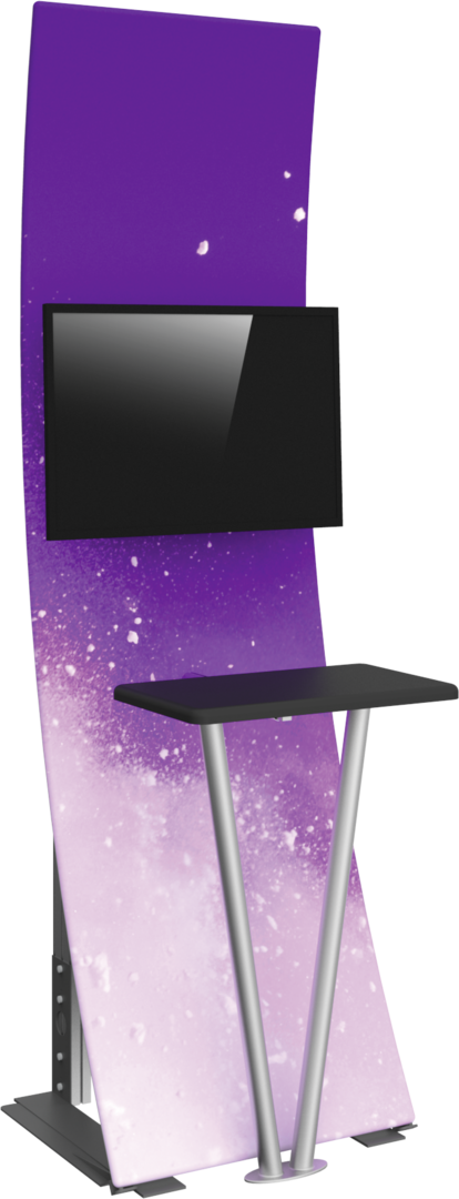 Formulate® Kiosk 01 couples a lightweight vertical curved aluminum tube frame with a printed stretch zipper pillowcase fabric graphic to create a funky and functional multimedia kiosk. An integrated monitor mount and table top provide space for digital messaging and display, and the gently curving back panel draws the eye.