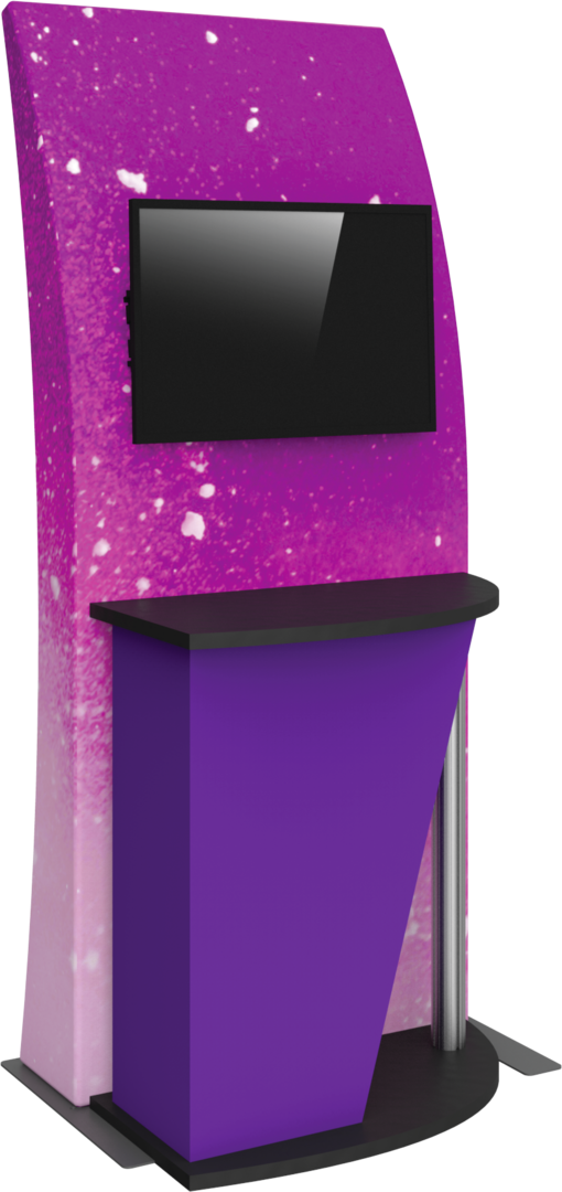 Formulate® Kiosk 04 couples a lightweight aluminum tube frame with a state- of-the-art printed stretch zipper pillowcase fabric graphic to create a funky and functional multimedia kiosk. An integrated monitor mount and fabric counter provide space for digital messaging and display, and the gently curving back panel draws the eye.