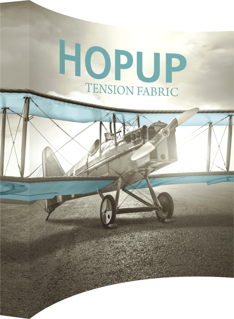 Hopup™ 10ft (4 quad x 4 quad) curved pop up display is a towering, dynamic display that provides both dimension and visibility. The display measures 10ft in height, yet sets up in seconds with its lightweight, collapsible frame. The Hopup is a fast, affordable, portable display solution that features high-quality graphics and exceptional ease of use. Option available to purchase frame separately.