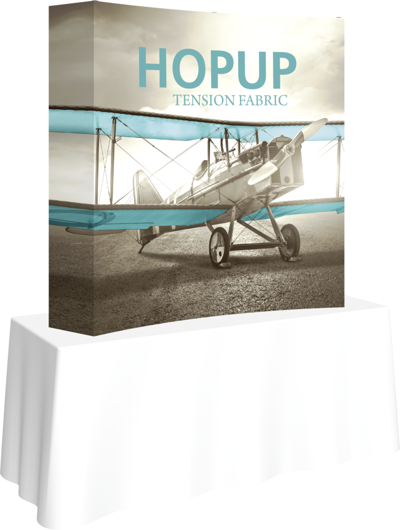 Hopup™ 5ft (2 quad x 2 quad) tabletop pop up display is an easy to use, impactful portable solution. The curved lightweight frame adds dimension to the tension fabric display, which sets up easily without the use of tools. Optional graphic endcaps are available, and a carry bag is included for transport. Option available to purchase the frame only.