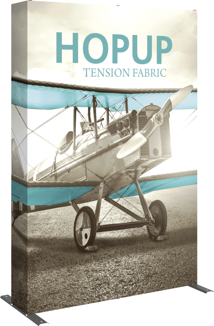 Hopupâ„¢ 5ft (2 quad x 3 quad) straight full height tension fabric display is a highly portable display solution. Hopup 2x3 Straight features a lightweight, durable aluminum frame and a pre-attached, hook and loop-applied straight fabric graphic. Simply attach the graphic, pop (expand) the frame and you have a perfect full height display, no tools are required for assembly! A rolling carry bag for storage and transport is included. Option available to purchase the frame only.