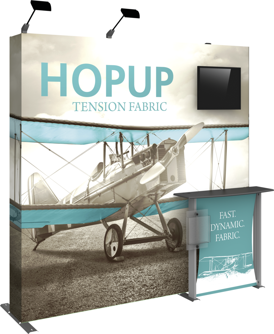 Hopup™ 7.5ft (3 quad x 3 quad) tension fabric backwall and Backwall Accessory Kit 02 is a complete display kit, featuring a 7.5ft graphic backwall, integrated monitor mount, and a stand-off counter display with literature pocket and fabric graphic accent. Accessories provide additional space for incorporating design elements and messaging for your brand. Display lighting is included to further make your messaging stand out. Set up is easy, as Hopup quickly expands and display accessories easily attach to the frame.