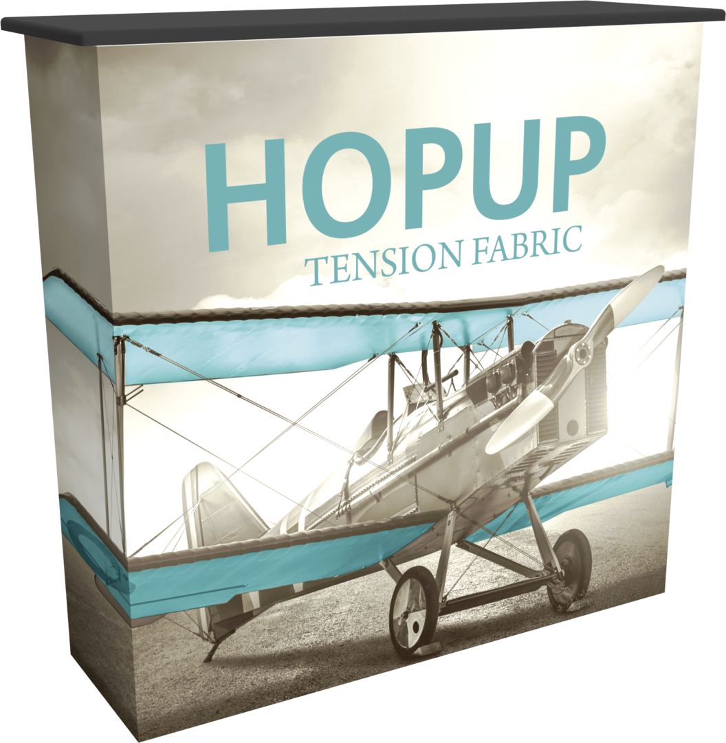 The Hopup™ Counter mimics the construction and assembly of the traditional Hopup tension fabric displays, making it simple, versatile and able to be set up in seconds. The Hopup Counter features a lightweight, collapsible anodized silver frame, hook and loop-applied fabric graphic, and choice of four counter top colors. A clear internal shelf provides additional space for storage. The graphic attaches easily to the counter and stays on for easy storage, and all parts store compactly in a carry bag. The Hopup Counter is the perfect addition to any Hopup backwall display, and tradeshow and event environments.