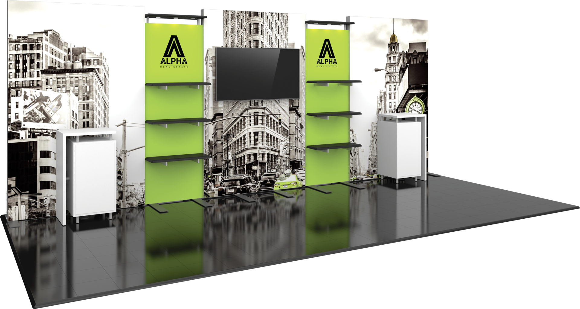 Hybrid Pro™ Modular Kit 31 is a functional, fashionable modular exhibit that will turn heads at your next tradeshow. Kit 31 features five push-fit fabric backwalls. The center wall includes a monitor mount that can hold a medium monitor. Two of the backwalls feature three black shelves to display small products; canopies above include puck lights designed to shine light on products below. The right and left walls are areas for bold graphics and messaging; accent counters offer areas for reception and engagement. This inline modular exhibit has a little bit of everything for the ultimate tradeshow experience!