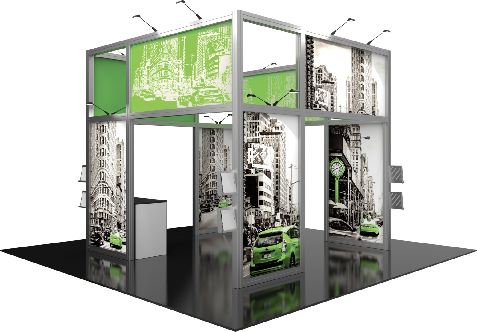 - Kit includes frame, sixteen fabric graphic panels, one white laminate counter, eight literature holders, sixteen 200 LED floodlights and one woodcrate