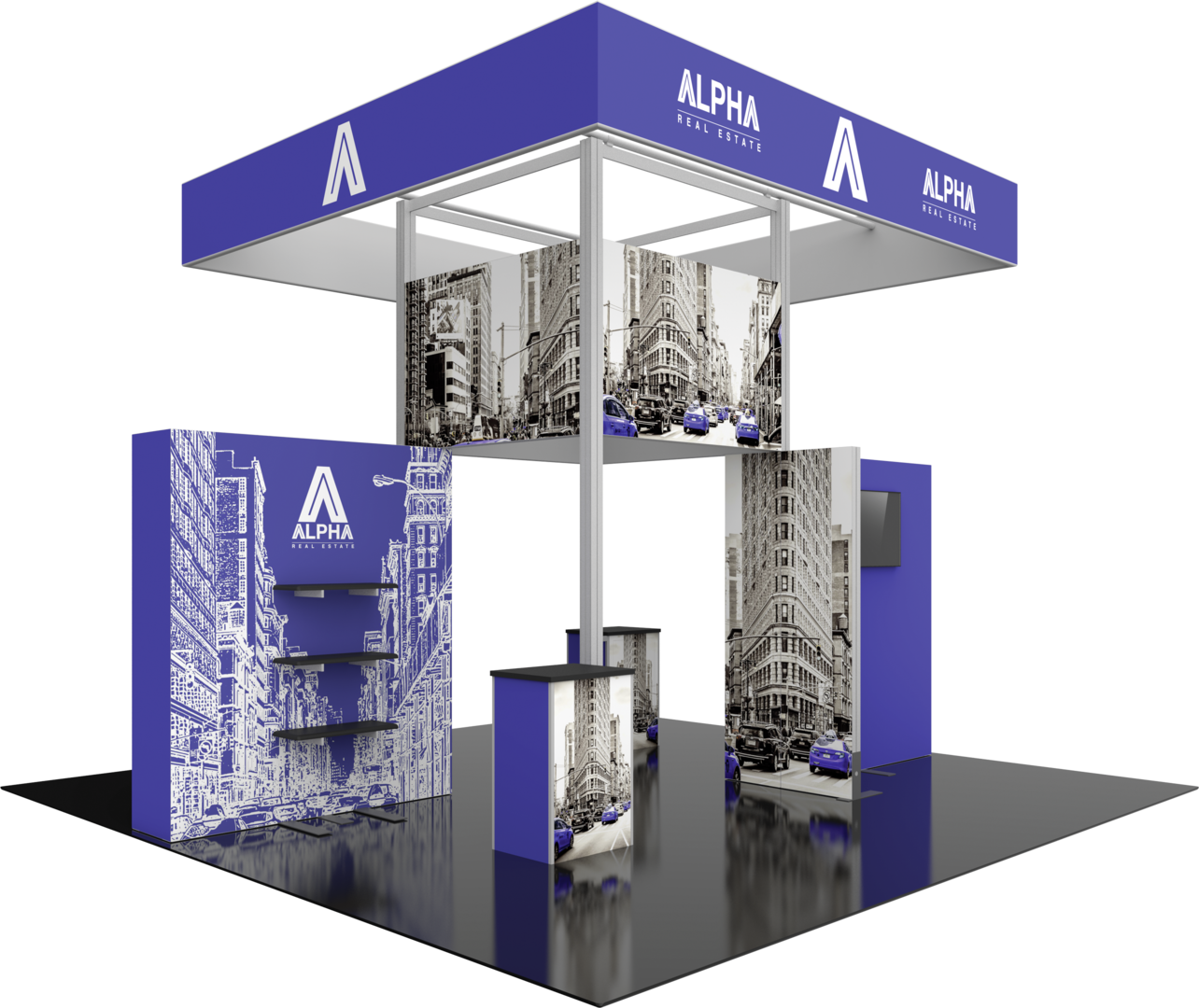 Hybrid Pro™ Modular Kit 23 is a sophisticated and symmetrical 20ft x 20ft island exhibit, perfect for an exhibitor looking for features and functionality. Kit 23 features a heavy-duty aluminum extrusion center frame that supports two square-shaped fabric structures. The top fabric structure is a tube structure with pillowcase fabric graphics and is meant to display your company logo so all in the exhibit hall can see it from afar! The center square utilizes the extrusion posts to create an additional area for branding and messaging above eye-level. Two 8ft tall floor displays add features and functionality. With medium monitor mounts and three shelves for small product display on each, the floor-based displays are designed to show and communicate your service offering in digital form and your product in physical form. Counters near the center posts add areas for storage and reception.