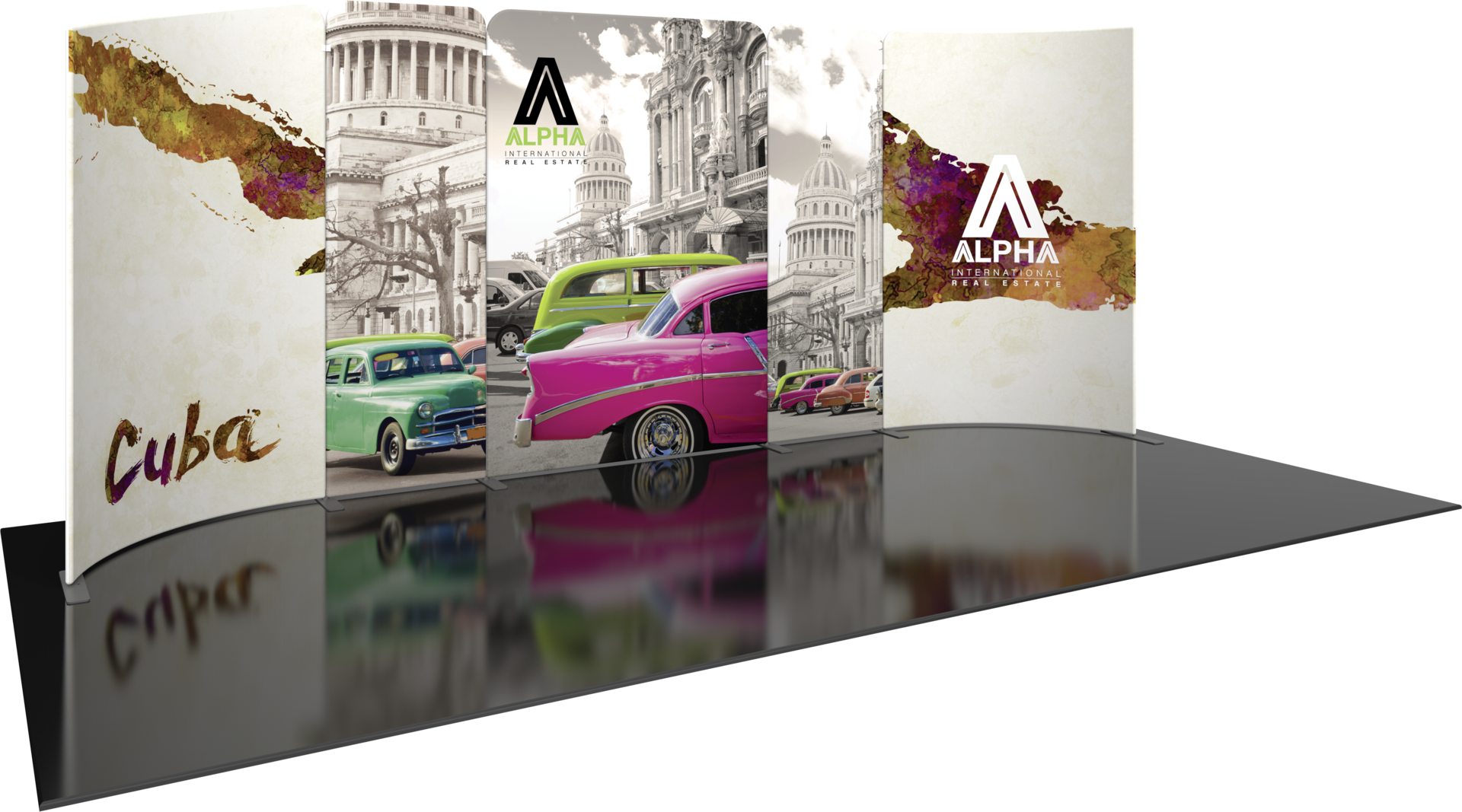 Modulate 20ft Kit 04 consists of three straight and two curved, magnetic banners. Kit 04 can reconfigure into a 10ft display (MOD-FRM-09-M-TL + MOD-FRM-10-M-TL) and can also be repurposed as individual banners. Versatile, simple and smart displays help exhibitors maximize their exhibit value. Modulate Reconfigurable Kits