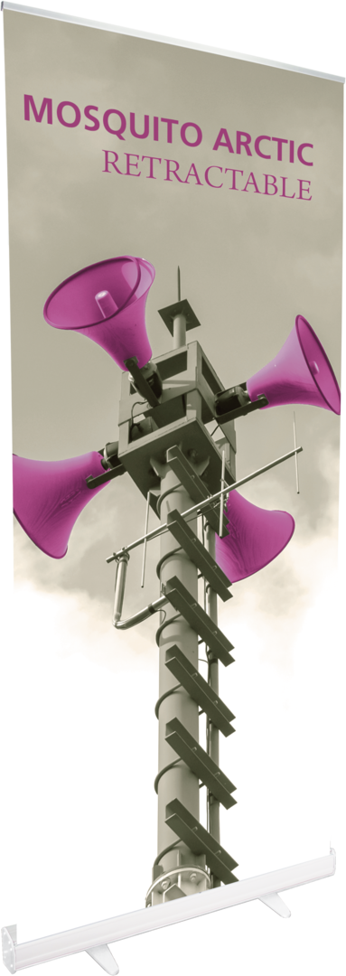 The Mosquito Arctic 850 is an affordable, basic banner stand that features a white, plastic base and white endcaps. This economy banner stand includes the base, retractable graphic, three-piece bungee pole and carry bag and is very simple to assemble.