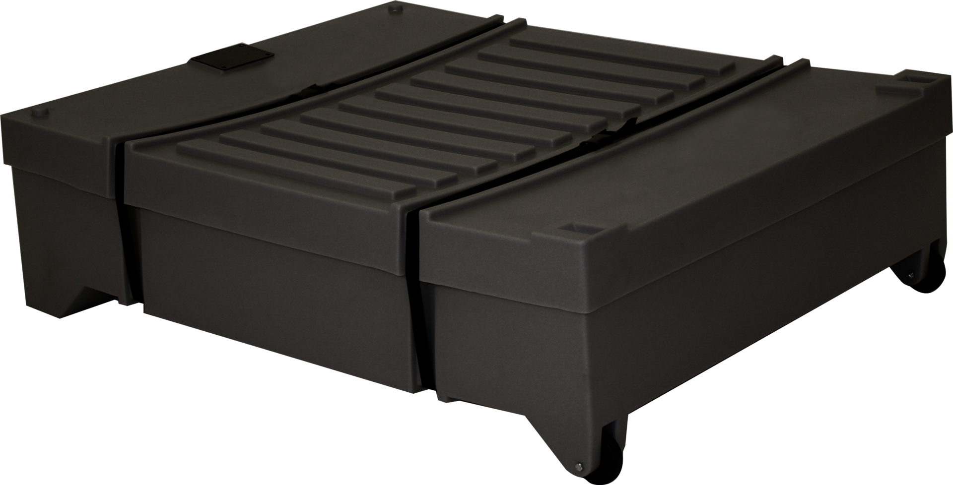 This black transit case is the perfect, premium protective freight shipping case for a variety of large exhibits.. Interlocking surface enables two cases to be transported together. Secure reinforced straps assure case will remain closed during transportation. A maximum case depth of 8" allows up to eight flat panels per case.