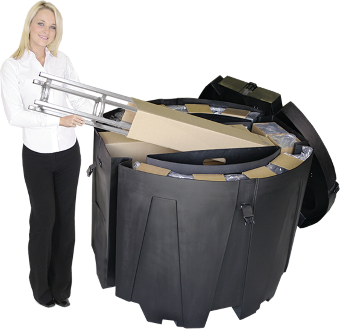 This large, round general purpose case is designed to handle national and international freight shipments for large Orbital Express truss displays as well as a variety of other large exhibits. The OCT is stackable and can be moved using the built-in casters or with a forklift. Offering the maximum protection for your exhibit materials, the OCT is a heavy-duty but eco-friendly choice that is made in the USA.
