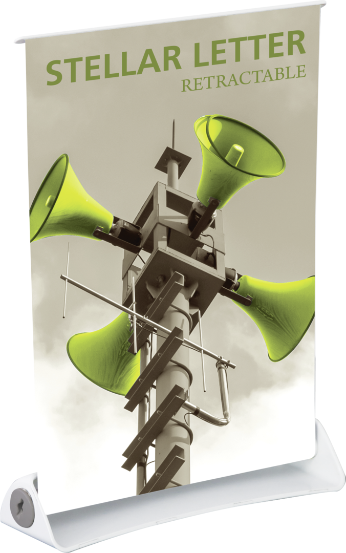 The Stellar Letter tabletop retractable banner stand features a lightweight, injection-molded white plastic base and is ideal for adding messaging to tabletop displays without sacrificing valuable space. The compact 9.13"W x 11.75"H design provides big impact with unique styling.