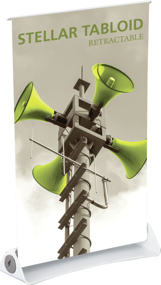 The Stellar Tabloid is a lightweight, injection-molded white plastic tabletop retractable banner stand ideal for adding messaging to tabletop displays and exhibits without sacrificing valuable space. Stellar Tabloid measures 11.6"W x 17.75"H and provides big impact with unique styling.