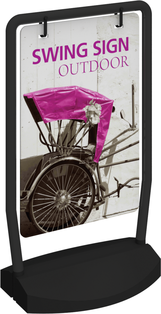 The Swing Outdoor Sign is a sleek and portable outdoor sign featuring an economy black steel tube frame, double ring mounting clips to keep graphic securely in place and wheeled, fillable base. The Swing Sign allows for easy graphic changes and replacements and comes with your choice of single or double-sided graphics printed on 6mm PVC board. The wheels make the sign easy to move!