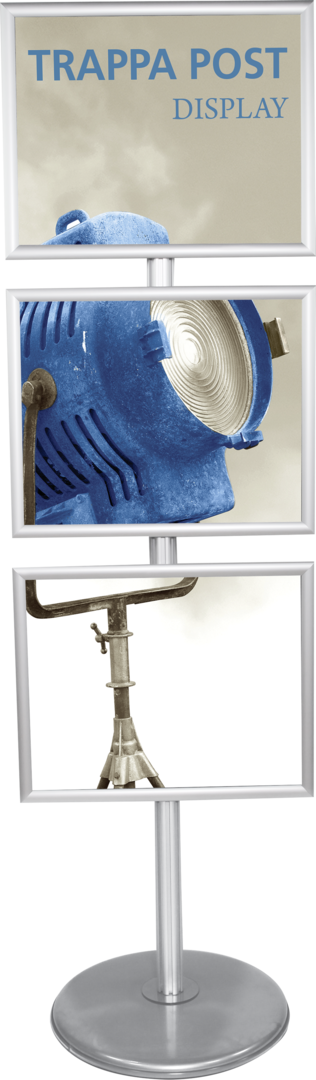 Easily display a graphic or message with a versatile and easy-to-assemble sign stand. Trappa Posts feature snap sign frames and come in a variety of configurations and sizes. Sturdy aluminum posts and heavy domed steel base plate ensures stability. Choice of silver or black snap frames, large or small, landscape, portrait or diagonal.