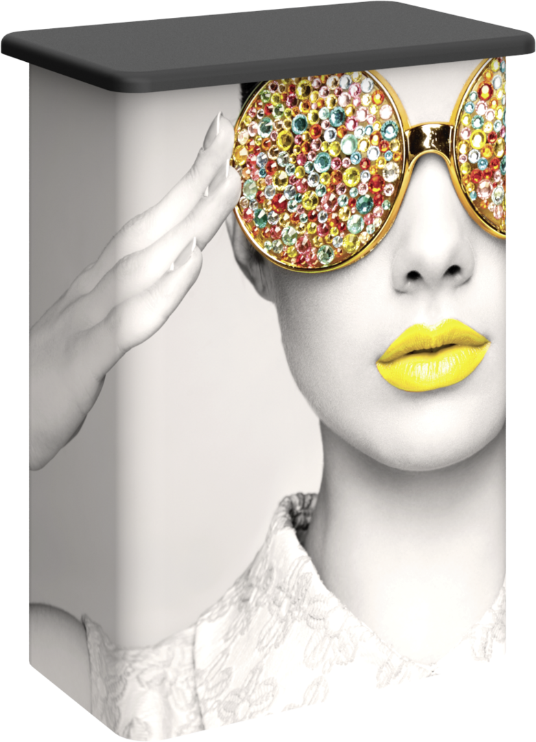 Vector Frame⢠Counter 04 complements the Vector Frame series of exhibit kits, but is also ideal for any stand-alone event or display. Featuring a slim rectangular shape, Vector Frame Counter 04 is an easy-to-use, easy-to-transport counter that combines includes simple extrusion-based frames, an internal shelf and your choice of push-fit fabric or rigid graphics. Tabletop is available in four color finish options.