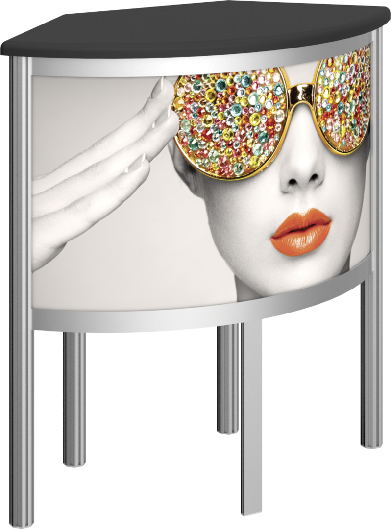 Vector Frame⢠Counter 06 complements the Vector Frame series of exhibit kits, but is also ideal for any stand-alone event or display. Featuring a traditional four-leg style shape and arching tabletop, Vector Frame Counter 06 combines simple extrusion-based frames and choice of push-fit fabric or rigid graphics. Tabletop is available in four color finish options.