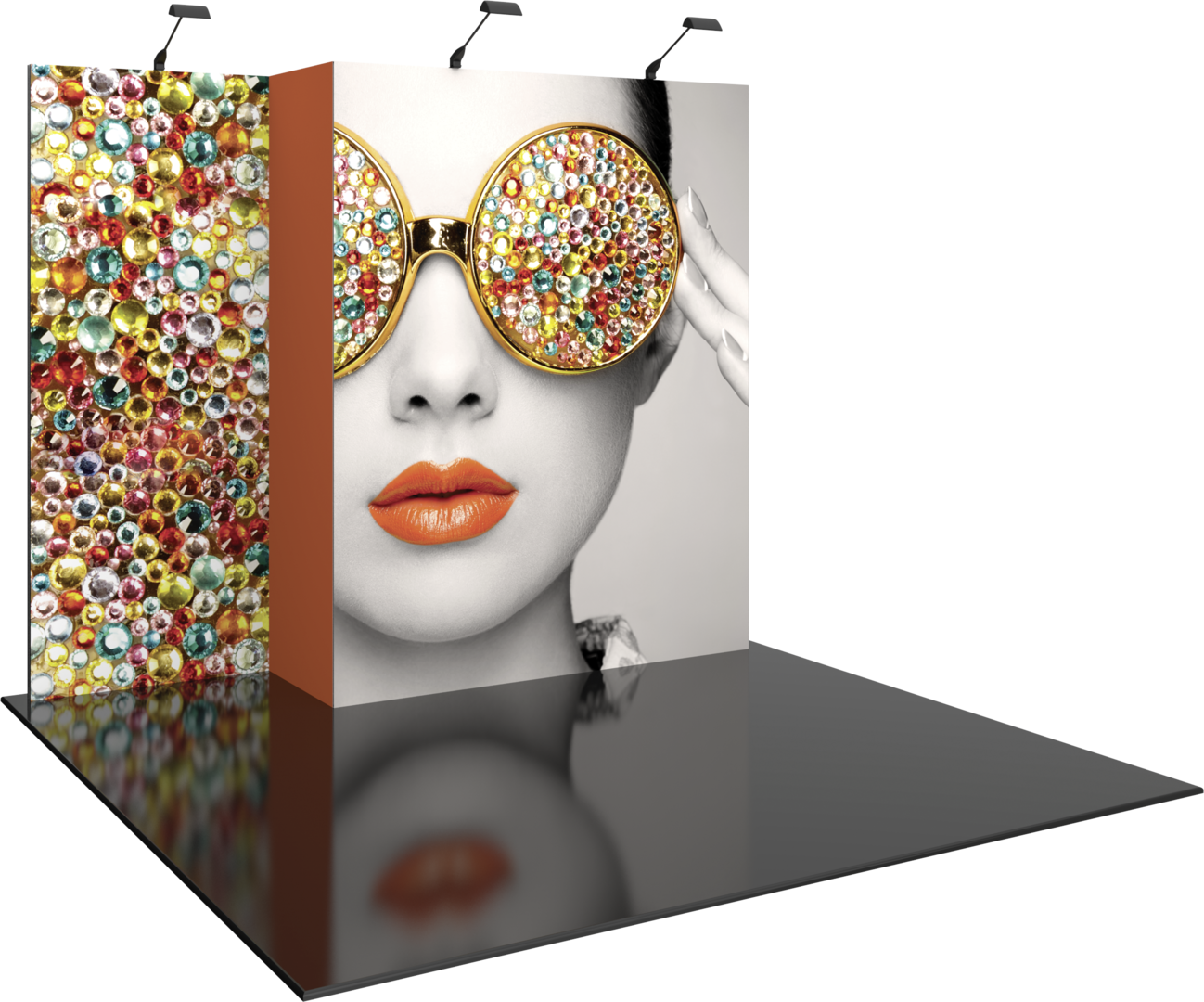- Kit includes frame, four fabric graphics, three 120 watt floodlights, one wheeled molded case