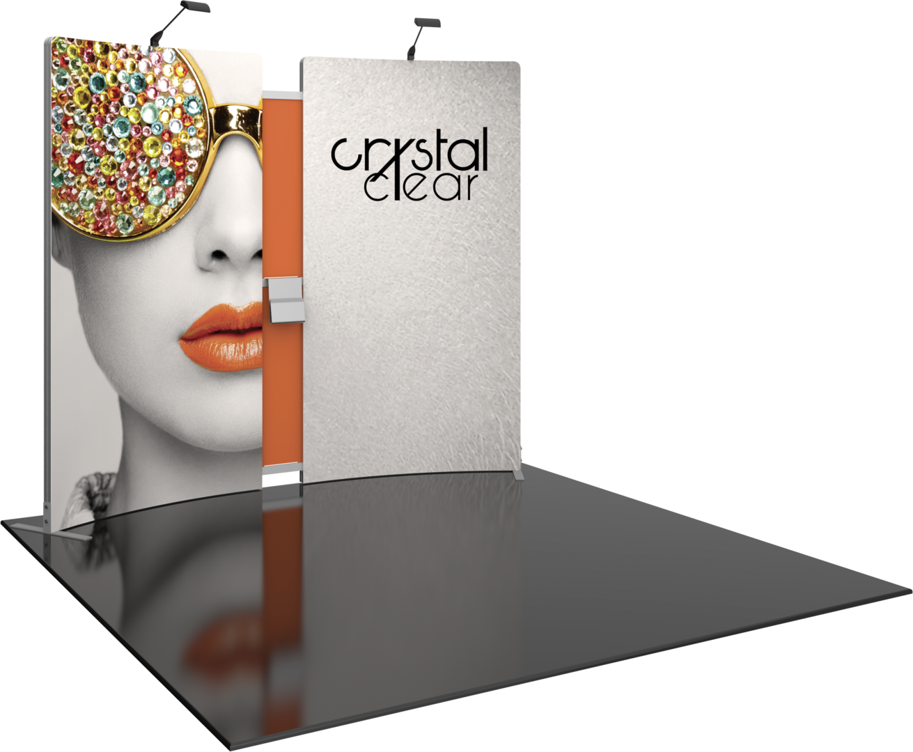 - Kit includes frame, two fabric graphic panels, two rigid graphic accents, two 120 watt lights, literature rack and one wheeled molded case