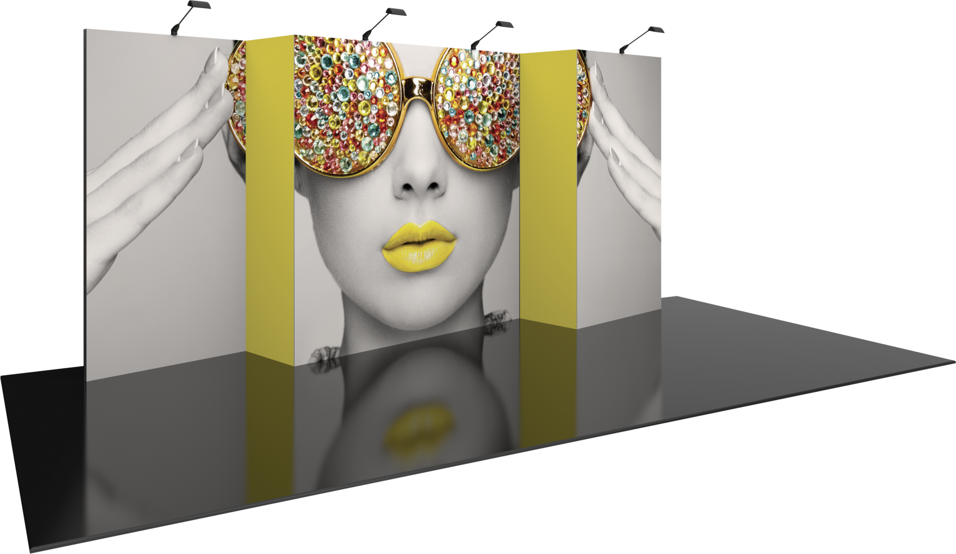 - Kit includes: one frame, five fabric graphics, four 120 watt floodlights, and one wheeled molded cases