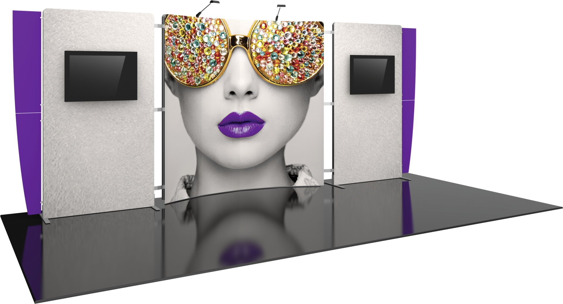- Kit includes: three frames, three fabric graphic panels, four rigid graphic wing accents, two monitor mounts*, two 120 watt lights, and one wheeled molded case