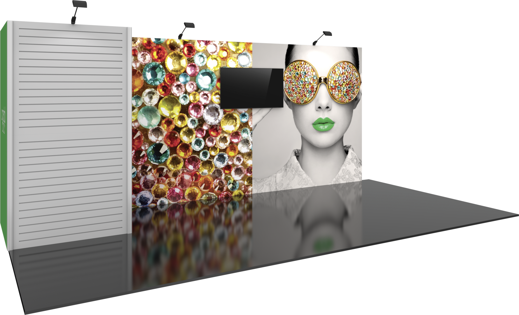 The 10ft x 20ft inline Vector Frame⢠Kit 26 is a robust modular exhibit that has a lot of bells and whistles! Extrusion frames are coupled with push-fit SEG graphics to create a sleek, seamless appearance. Functionality is delivered with a storage closet, slot wall for hanging merchandise and a monitor mount to hang a TV for promotional use.