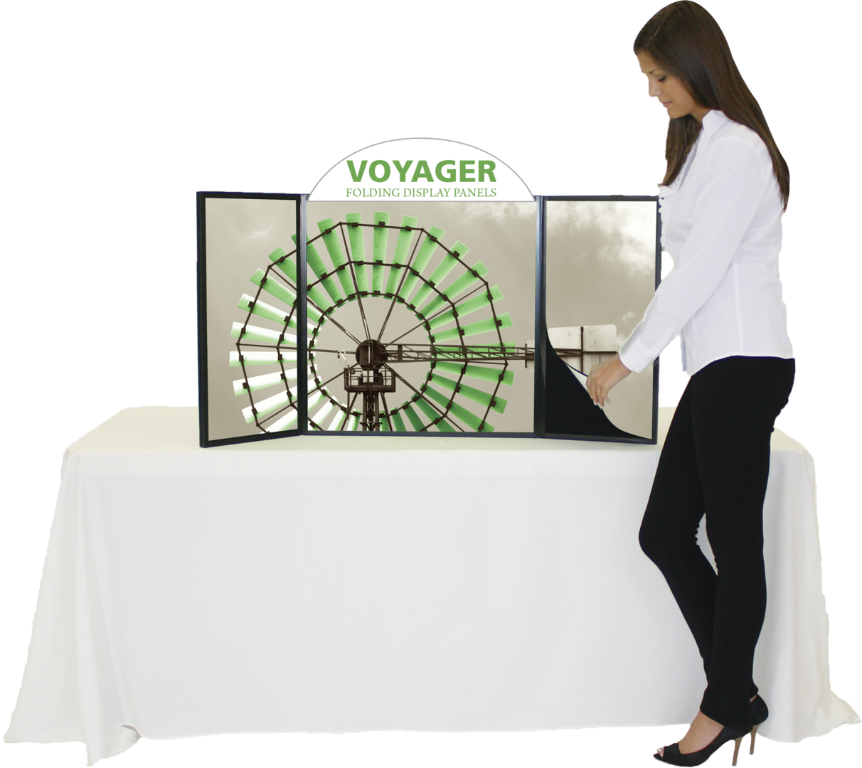 The Voyagerâ„¢ Maxi has been specially developed as a briefcase style, tabletop display and is a great choice for promotions on the go. It measures 48in wide and 24in high when open, and has a rigid, thermos-formed ABS exterior and a black, Hook and loop compatible fabric interior. Optional detachable 22mil PVC graphics and header panels available. Extra graphics can be stored in the display and packed away for easy storage. Voyager Maxi has a lifetime hardware warranty against manufacturer defects. Pictured header sold separately.