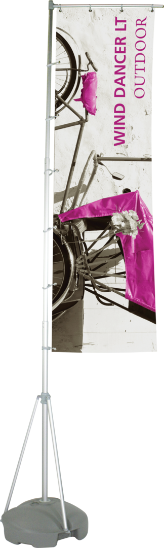 Wind Dancer LT telescopic outdoor flagpole is the perfect banner display for both indoor and outdoor environments. It offers an adjustable display height of up to 13'6" and comes with a hollow base allowing the option of adding either water or sand as a weighting agent. The constructed unit is easy to position, erect and remove.