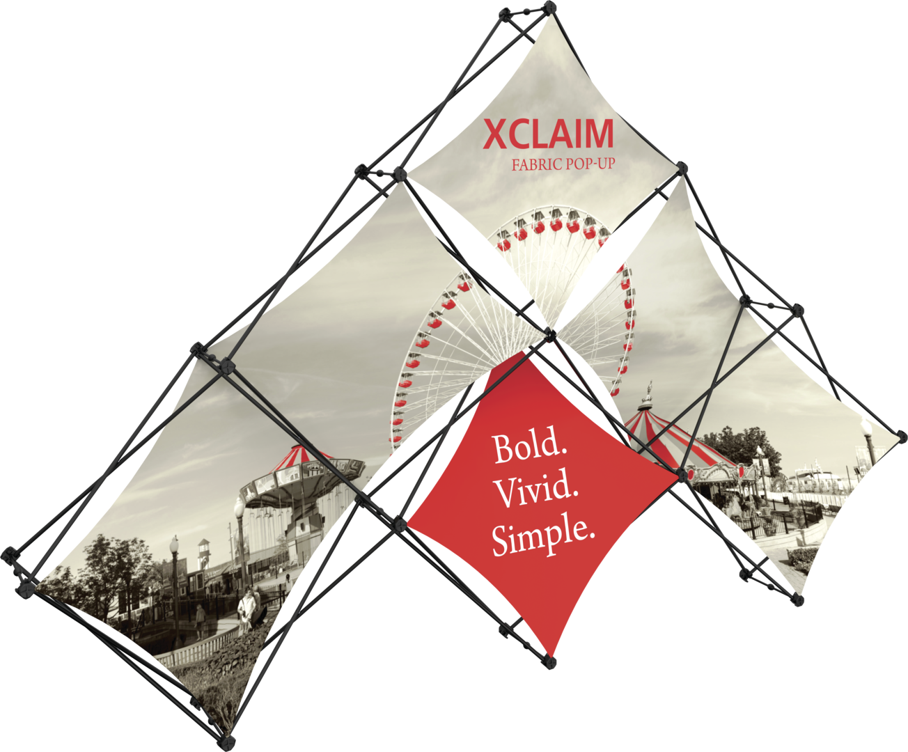 Xclaim 10ft wide 6 Quad Pyramid Kit 01 is a versatile stretch fabric popup display. Add dimension to your event or tradeshow with unique, exciting graphic styles. Xclaim 6 Quad Pyramid Kit 01 easy to setup, is lightweight and portable. The collapsible popup frame is fully magnetic (with magnetic linking connectors), making it simple to assemble and disassemble. Stretch fabric graphics come pre-attached to the frame, making assembly easy and fast. Graphics adhere to the hubs using push-fit attachment technology. Xclaim 6 Quad Pyramid Kit 01 comes with graphics, frame and soft case with a shoulder strap.