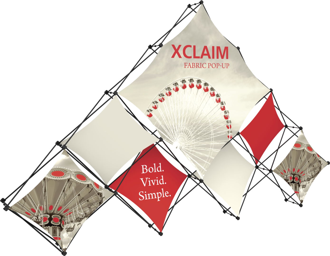 Xclaim 14ft wide 10 Quad Pyramid Kit 03 is a versatile stretch fabric popup display. Add dimension to your event or tradeshow with unique, exciting graphic styles. Xclaim 10 Quad Pyramid Kit 03 is easy to setup, lightweight and portable. The collapsible popup frame is fully magnetic (with magnetic linking connectors), making it simple to assemble and disassemble. Stretch fabric graphics come pre-attached to the frame, making assembly easy and fast. Graphics adhere to the hubs using push-fit attachment technology. Xclaim 10 Quad Pyramid Kit 03 comes with graphics, frame and soft case with a shoulder strap.