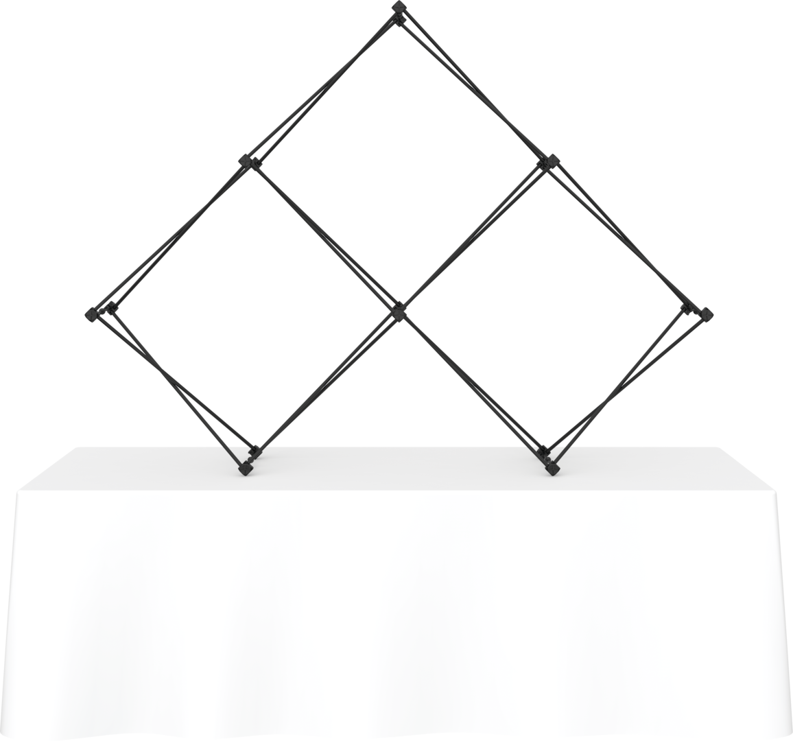 - 8ft wide, pyramid-shaped tabletop fabric popup display frame